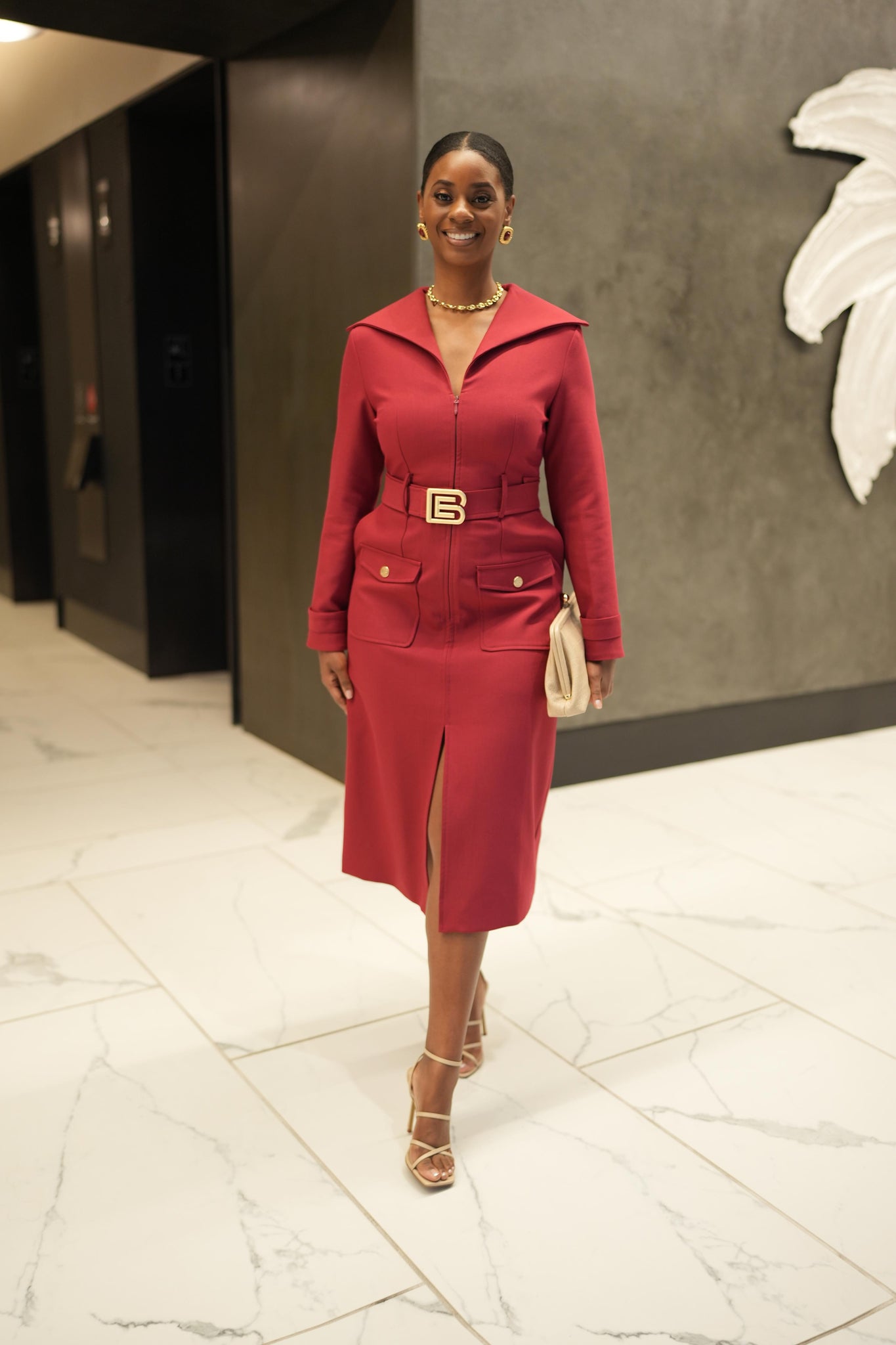 The Velora trench dress delivers modern elegance with a refined, tailored silhouette. Crafted from our structured, premium-weight fabric, Velora offers a smooth, flattering silhouette that holds its shape beautifully throughout the day. in a rich burgundy hue, it features a wide lapel collar and a waist-defining belt adorned with B.Encore’s signature gold-tone logo buckle. The front flap pockets, side hidden pockets and a mid-length hem add classic trench-inspired structure, while a front slit allows graceful movement. A polished statement piece perfect for business events, work, formal gatherings, and elevated everyday wear.